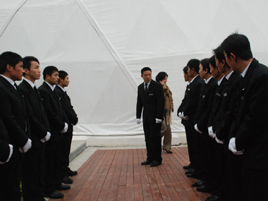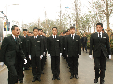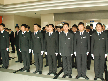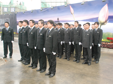 11月29日60余名擎天隊(duì)員脫下制服換上西裝,整裝待發(fā)。10點(diǎn)準(zhǔn)時(shí)到達(dá)活動(dòng)目的地---“華麗家族-太上湖”項(xiàng)目地。隊(duì)員下車(chē)后排成了整齊的方隊(duì),統(tǒng)一的服裝,整齊的步伐,帥氣的面孔,響亮的口號(hào)吸引住了所有人的目光。