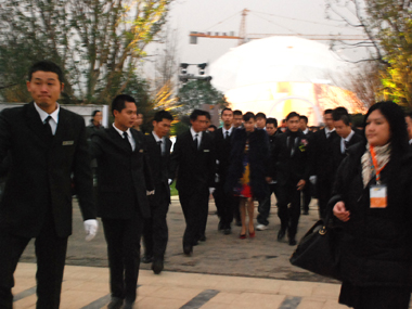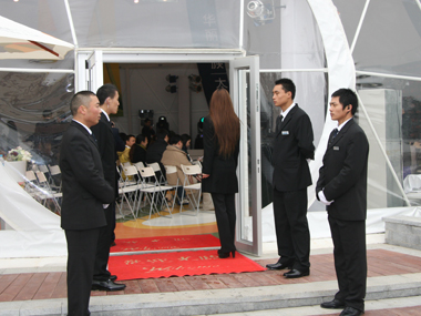 11點(diǎn)開(kāi)始,隊(duì)員開(kāi)始疏散現(xiàn)場(chǎng)所有閑雜人員,12點(diǎn)的時(shí)候,清理完畢。13點(diǎn)進(jìn)入布防崗位,14點(diǎn)我們的特保乘專車(chē)趕往梁朝偉和劉嘉玲下榻的酒店。15點(diǎn)整,梁朝偉、劉嘉玲亮相,他們?cè)谫F賓休息室里稍作休息后,進(jìn)入新聞發(fā)布會(huì)現(xiàn)場(chǎng),梁朝偉和劉嘉玲在我司8名隨身特衛(wèi)的保護(hù)下閃亮登場(chǎng)。同時(shí)到場(chǎng)的還有華麗家族的王偉林董事長(zhǎng)及其夫人一行。隨后, “華麗家族.太上湖”全球第一買(mǎi)家簽約儀式及記者招待會(huì)開(kāi)始,由著名主持人曹可凡和陳蓉主持。8名特衛(wèi)寸步不離兩位重量級(jí)嘉賓,其余隊(duì)員則負(fù)責(zé)外圍安全。